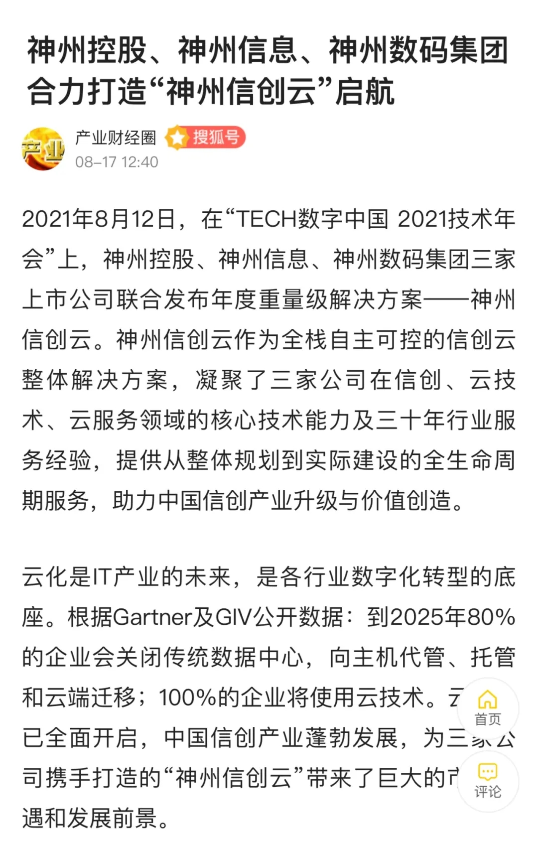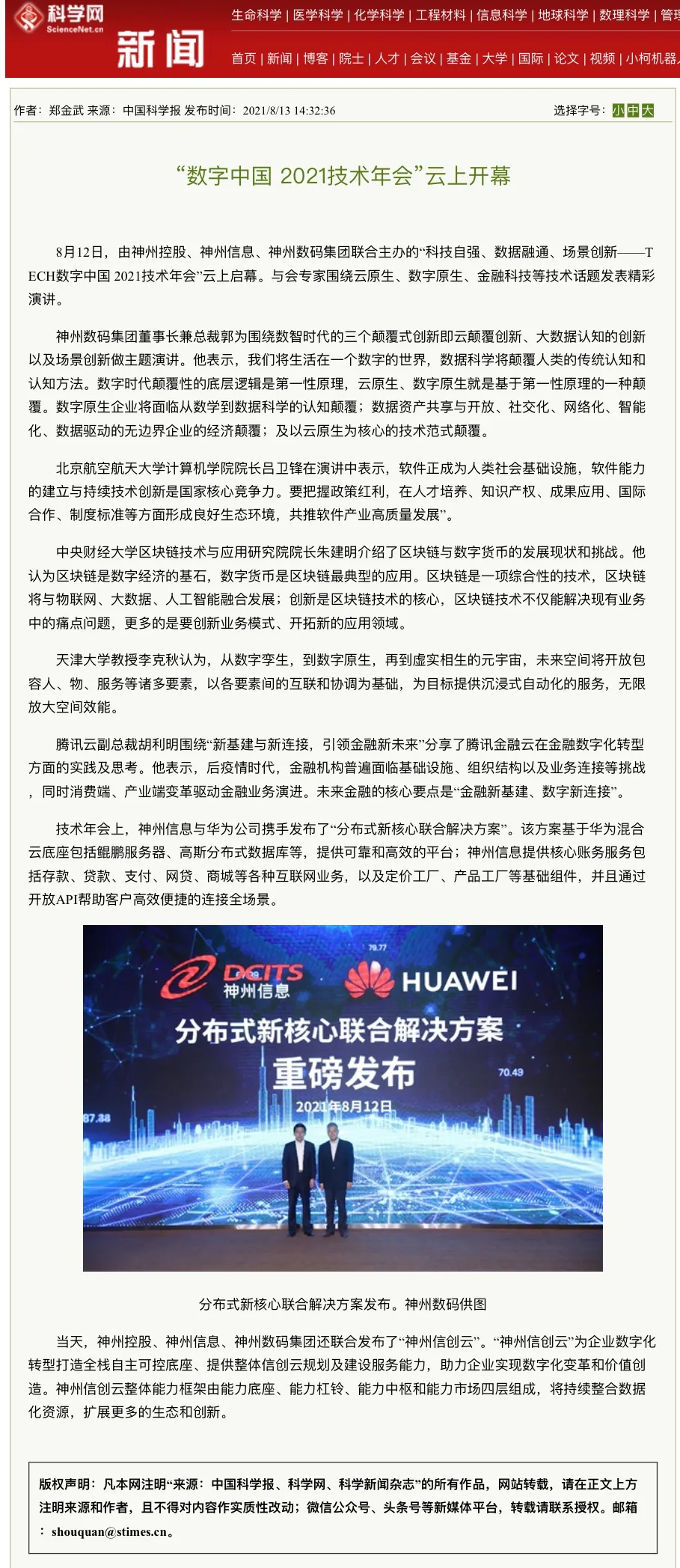 “数字中国 2021技术年会” 神州控股、神州信息、710公海寰宇集团联合发布 “神州信创云”