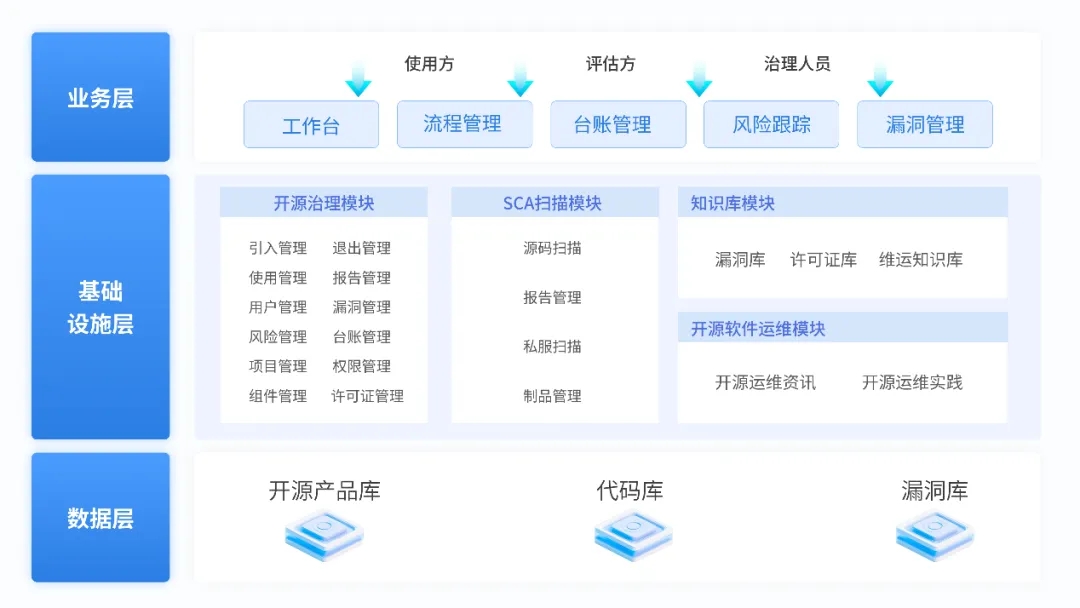 强化管理:通过构建开源技术引入、使用、退出全生命周期管控能力,帮助客户建立开源软件资产库,提升客户对软件资产的整体管理能力。通过软件物料清单,时刻关注、适配业界漏洞情报,帮助客户快速分析并识别可能存在的安全风险并及时预警。