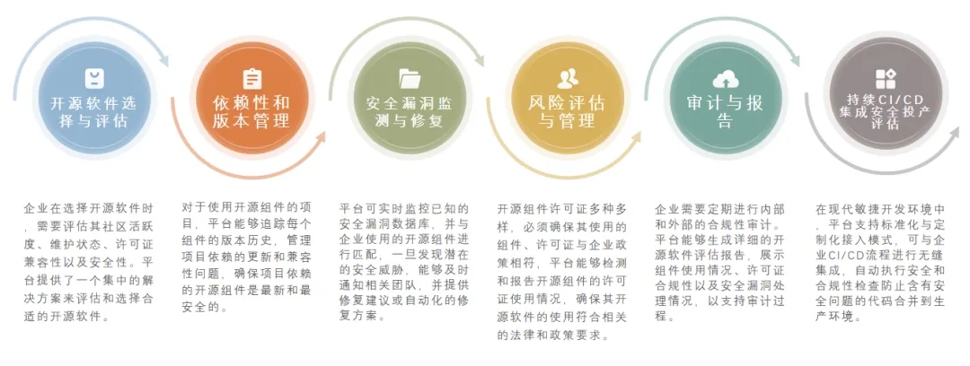 神州信息开源软件全生命周期安全管控平台包括“引入管理、使用监控、退出管理、成分分析(SCA)、物料清单可视化、合规性与审计”6大核心功能,覆盖开源软件使用的全生命周期: